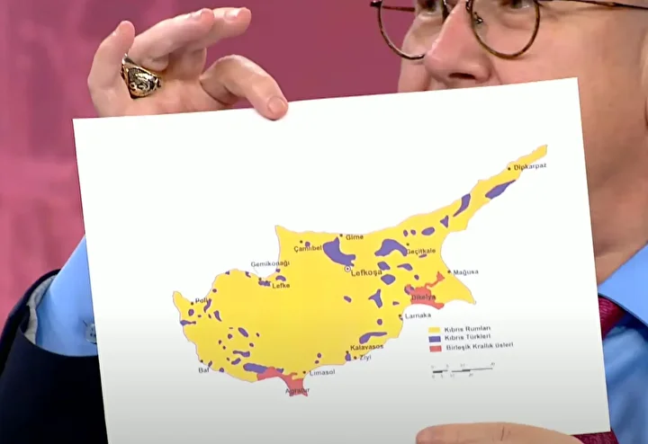 Ve bunun daha öncesi var. Aslında bu hepsi birbiriyle örtüşüyor. Bu “Greek-Jewish Plan” diye yayınlanmış. 1950’lerdeki bir haritadır: Yunan-Yahudi Planı. Evet, Yunan-Yahudi Planı. Burada morla işaretlenmiş olan yerler, Türk yerleşim yerleri. 1950’li yıllarda onlara göre, Yahudilere göre diyor ki: “Siz toprak alın ama buralardan toprak alın. Burası bir Yahudi-Yunan adası olsun.”