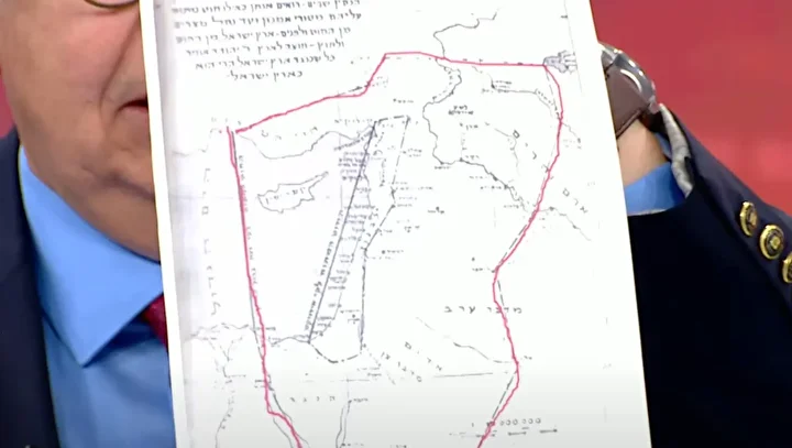 Buradan bakalım. Geldiğimiz noktada yaptığımız çalışmalarda İsrail’in toprak aldığı yerler bu haritayla birebir örtüşüyor. Birincisi, Yahudi-Yunan haritası sol tarafta paşanın tuttuğu ve yıllar önce mevcut bir deneme girişimi. Ya da bir kısmı tabii oldu. Oldu, oldu. Oldu, yirmi beş bin dönüm arazi Kuzey Kıbrıs’ta. Sadece yirmi beş bin dönüm arazi — apartmanları, evleri saymıyorum bakın — arazi diyorum, İsrailliler tarafından 2020 yılında satın alınmıştı.