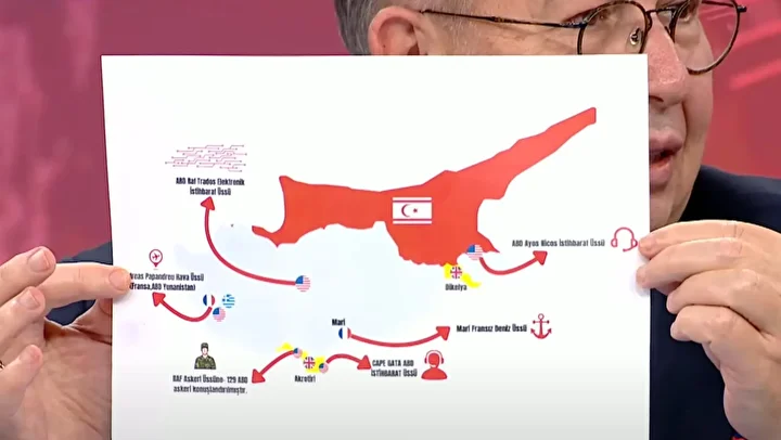 Ve son olarak da şunu ifade edeyim: Bu da Güney Kıbrıs’taki üsleri gösteriyor. İsrail, Fransa, Amerika zaten orada toprağa sahip. Bunların hepsi beraberler. Rusya da var, enteresandır burada.