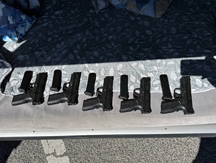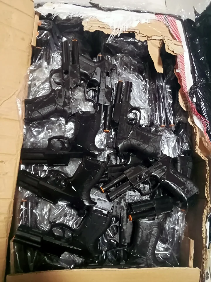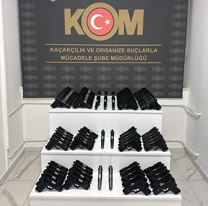 Şüphelilerin adres ve araçlarında ekiplerin aramalarında, 10 ruhsatsız tabanca, 5 ruhsatsız av tüfeği, 3 bin 102 kurusıkı tabanca, 14 bin 254 şarjör, silah yapımında kullanılan 19 bin 411 parça ele geçirildi.