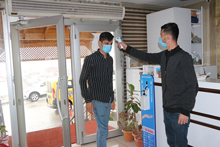 Şırnak’taki kafe ve restoranlara ateş ölçer getirilirken, sosyal mesafe uyarı etiketleri yapıştırıldı.