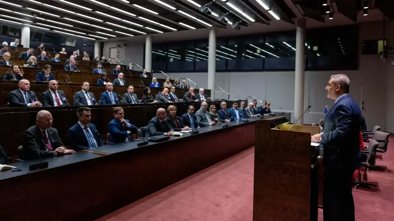 Dışişleri Bakanlığının NSosyal hesabından yapılan paylaşıma göre Fidan, başkent Helsinki'de Finlandiya Parlamentosunda konuştu.