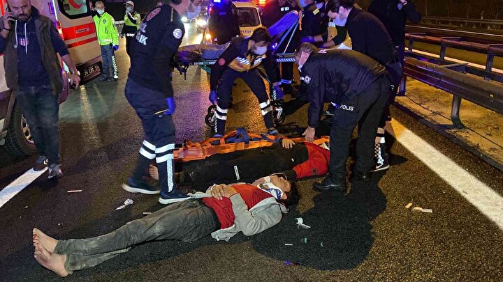 10 kişinin yaralandığı kazada itfaiye ve sağlık ekipleri yaralılara müdahale ederken yerde yatan yabancı yaralıya itfaiye eri üşümesin diye montunu üstüne örttü.