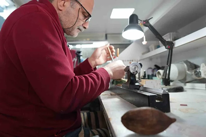 Erzincan’ın tek tespih işlemecisi Mehmet Aydın, Brezilya’dan getirttiği kuka ağacı meyvesini işleyip değerli taşlarla süsleyerek tespihler üretiyor.