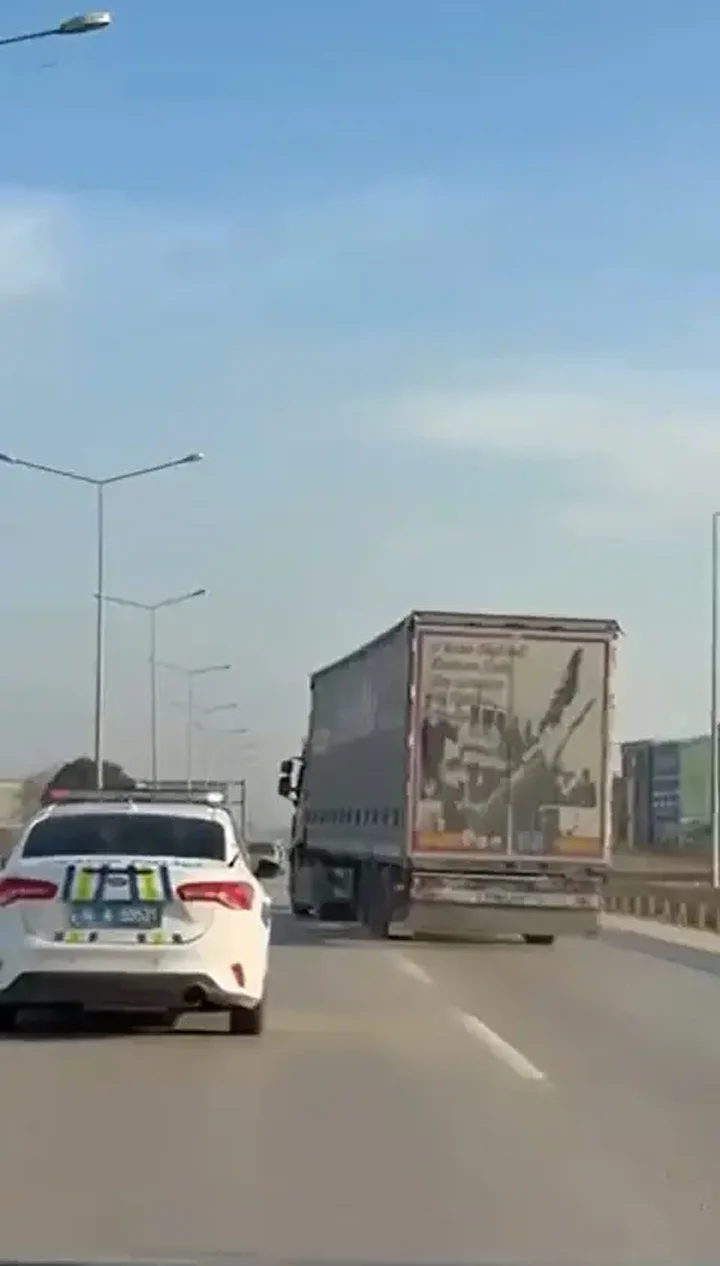 Bursa'nın İnegöl ilçesinde ‘dur’ ihtarına uymayan ehliyetsiz sürücü, polis ekipleri tarafından TIR'ın lastiklerine silah doğrultarak durduruldu. Takip, bir başka sürücü tarafından cep telefonu kamerasıyla görüntülendi.