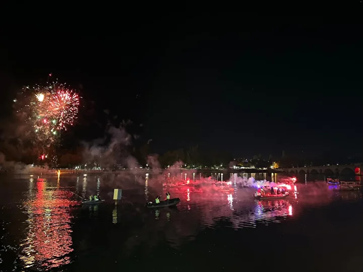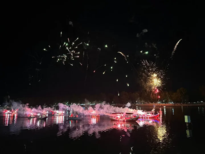 Kayıklar, eş zamanlı olarak havai fişek gösterisi eşliğinde nehirde tur atarak protokolü selamladı.