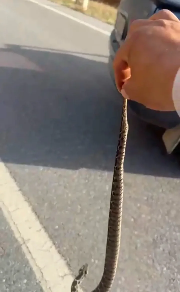 Kütahya'nın Hisarcık ilçesinde Süleyman Yolcu, yolda gördüğü ve kendisine saldırmaya çalışan, zehri ölümcül 'engerek' cinsi yılanı kuyruğundan yakalayıp, doğaya bıraktı.