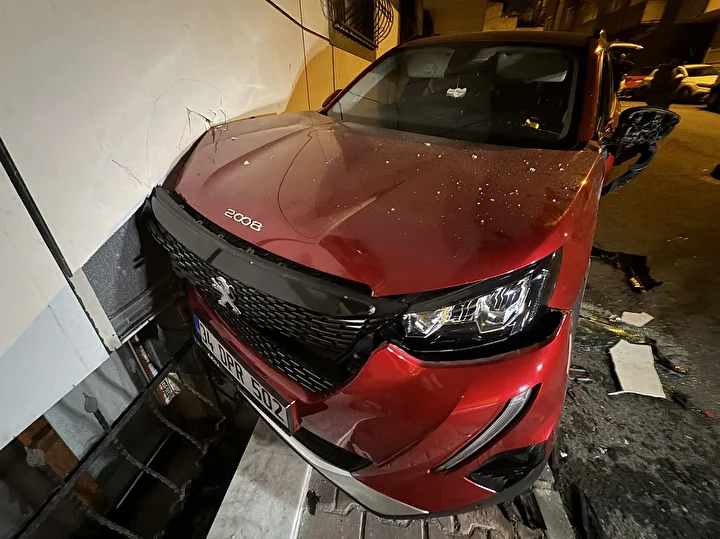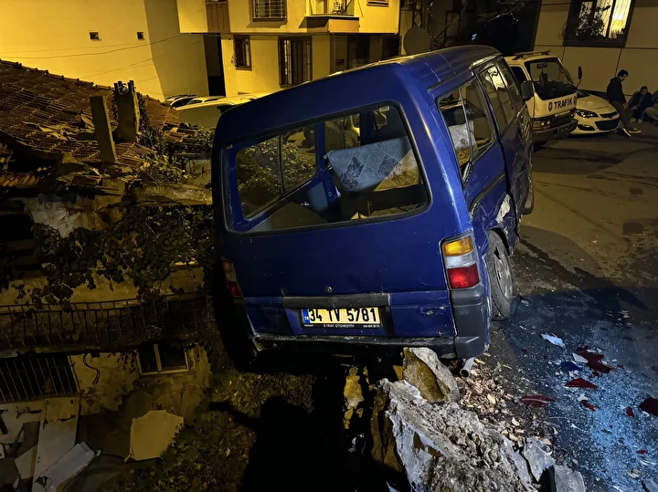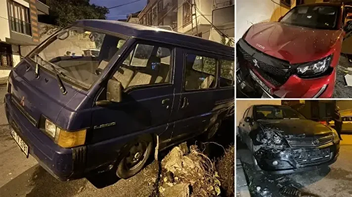 Çarpmanın etkisiyle bir minibüs bahçe duvarında asılı kalırken, sürüklenen bir otomobil de bina duvarıyla başka bir aracın arasında sıkıştı.
