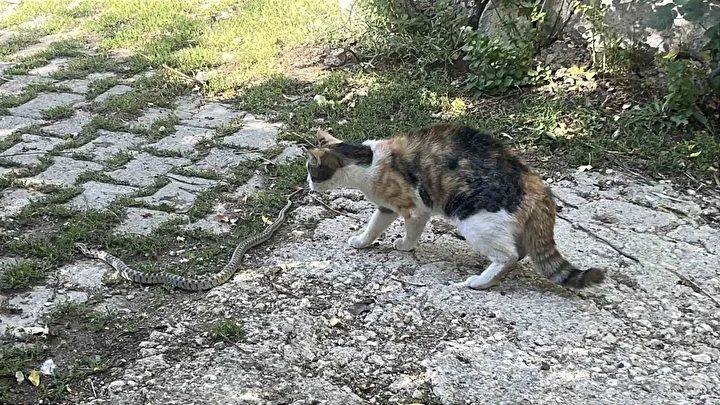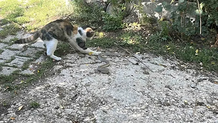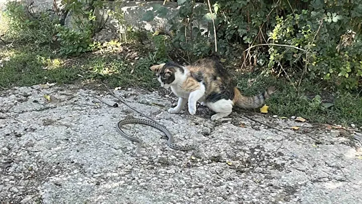 Kedinin yılanı ağzına alarak uzaklaştığını belirten Artan, "Biz normalde kediyle farenin çatışmasına denk gelirdik fakat bugün çok garip bir olay yaşadık. Arkadaşımla dolaşıyorduk, bir ses geldi, dönüp baktığımızda kediyle yılan kavga ediyordu. Kedi, yılana birkaç pati vurdu. Sanırım sonrasında yaraladı çünkü yılanı ağzına alıp bir yere götürdü. Çok garip bir şeydi bizim için" dedi.