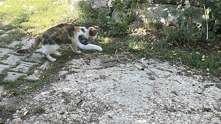 Görüntülerde, kedinin yılana yaklaşarak dikkatlice izlediği, ardından da pati darbeleriyle saldırdığı görülüyor. Bir süre karşı koymaya çalışan yılan, kedinin darbeleri sonrası hareketsiz kaldı. Kedi, öldürdüğü yılanı ağzına alarak, çevredeki eski bir yapının çatısına çıktı.