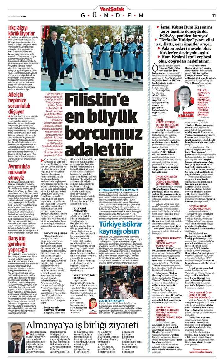 Yeni Şafak Gazetesi'nin 28 Kasım 2025 tarihli birinci sayfasında yer alan manşet ve haberler...