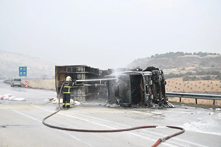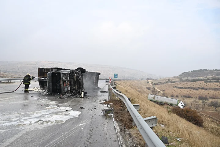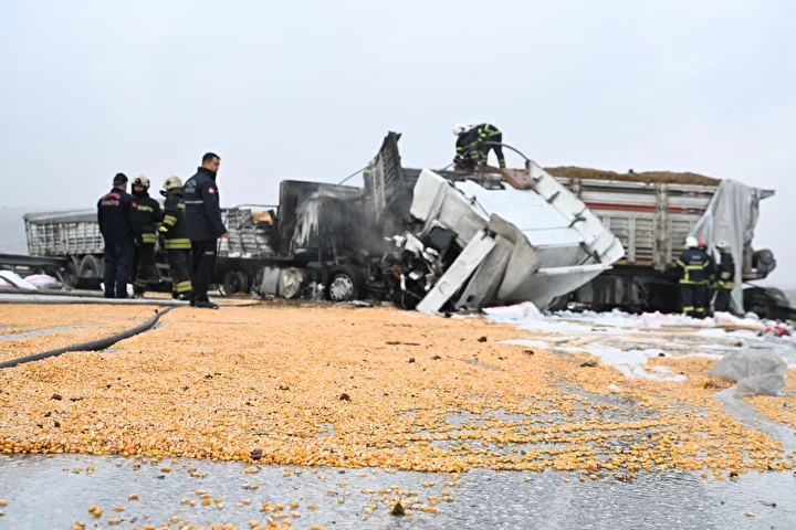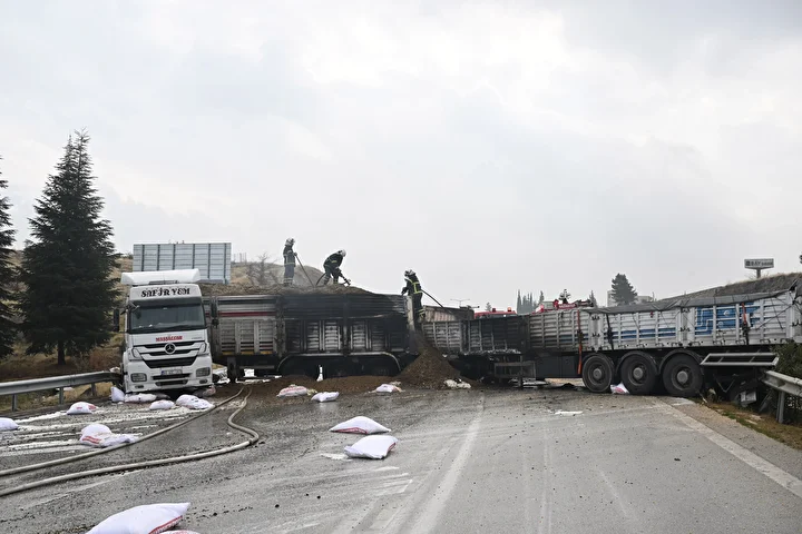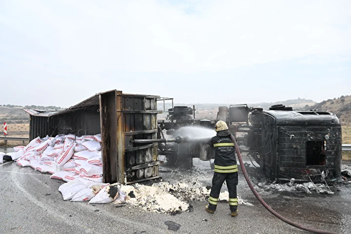 Gaziantep'te 3 tırın çarpıştığı zincirleme trafik kazasının ardından araçlarda çıkan yangın söndürüldü.