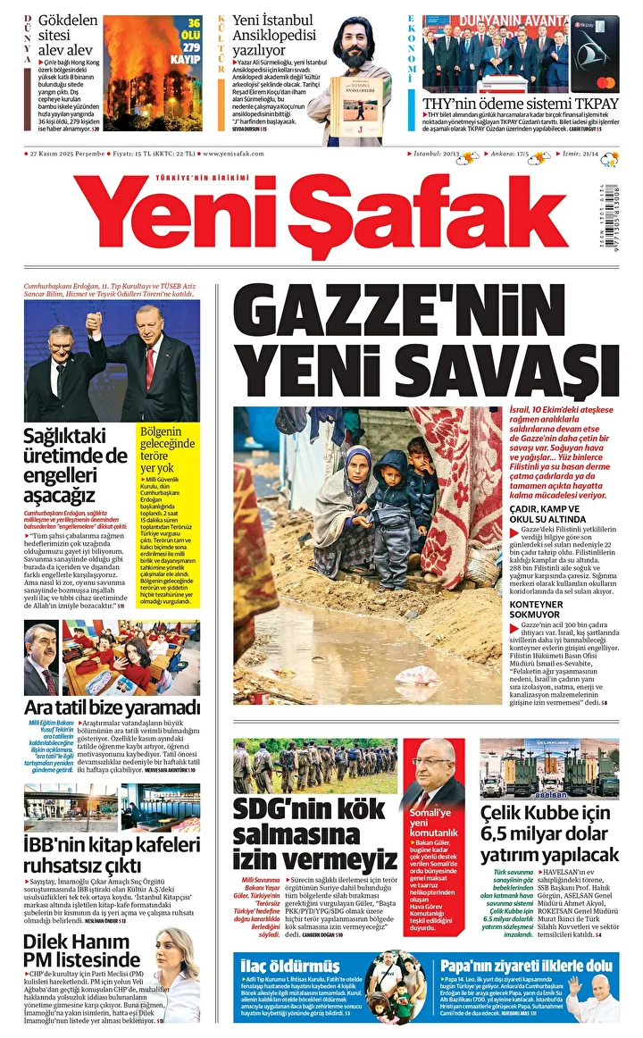 Yeni Şafak Gazetesi'nin 27 Kasım 2025 tarihli birinci sayfasında yer alan manşet ve haberler...
