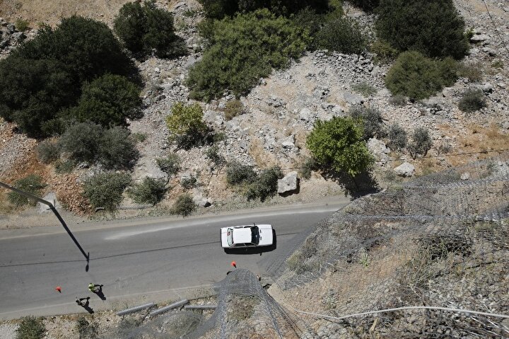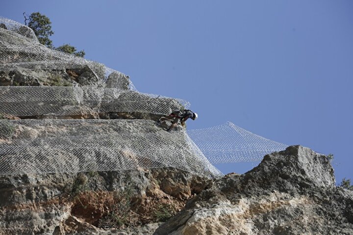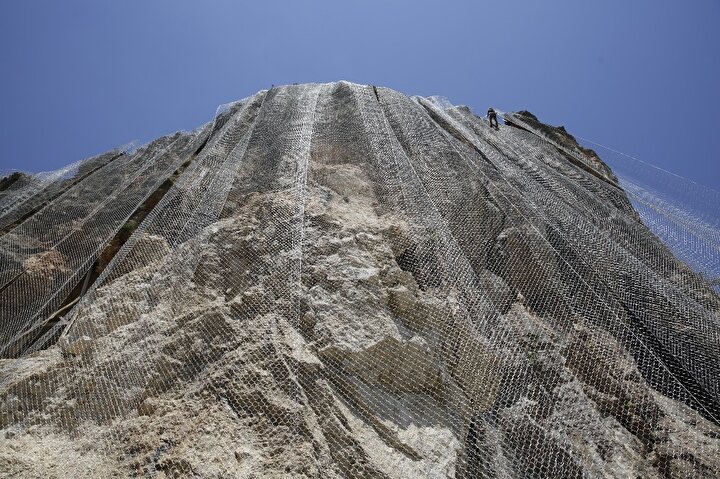 Yapılan çalışmalar sonunda ana kayadan kopan parçalar çelik ağ sayesinde güvenli bir şekilde zemine inecek.