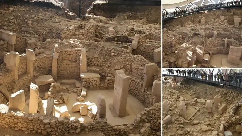 Kazılarda neolitik döneme ait, boyları 3 ila 6 metre, ağırlıkları 40 ila 60 ton olan, yabani hayvan figürlü "T" biçimli dikili taşlar bulundu. Ayrıca 8 ila 30 metre çapında dairesel ve dikdörtgen şekilli, dünyanın en eski tapınak kalıntıları ve yaklaşık 12 bin yıl öncesine ait olduğu belirtilen 65 santimetre uzunluğunda insan heykeli gibi çeşitli eserler gün yüzüne çıkarıldı.