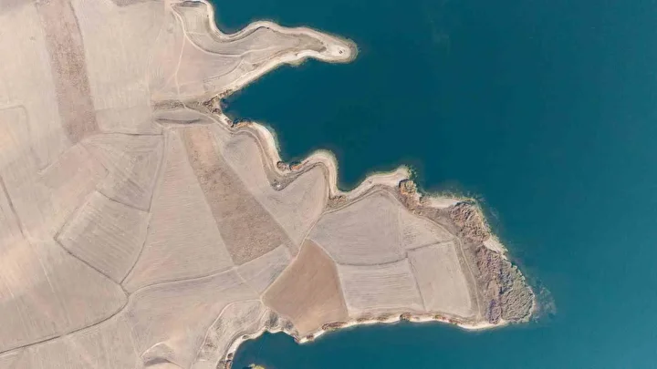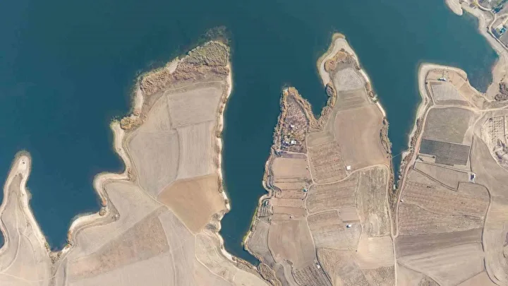 Havadan çekilen görüntülerde, baraj çevresini kuşatan tepelerin dalgalı yapısı, aralara serpiştirilen tarım arazileri ve Kızılırmak’ın baraja taşıdığı berrak su dokusu net biçimde görüldü.