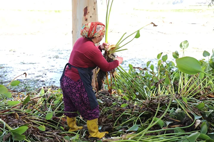 Hatay'ın Kırıkhan ilçesindeki Gölbaşı Gölü'nü kaplayan su sümbülleri, kadınların elinde dekoratif ürünlere dönüşüyor.