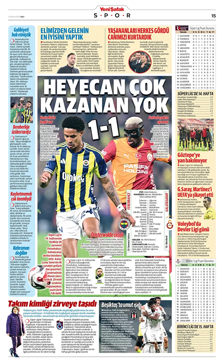 Süper Lig’in 14. haftasında Kadıköy’de oynanan Fenerbahçe- Galatasaray derbisi berabere bitti. Aslan, Lorey Sane’nin ilk yarıdaki golüyle öne geçerken, uzatmalarda Duran skoru eşitledi. Zirvede sıralama değişmezken, puan farkı 1’de kaldı.