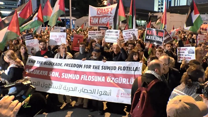 Beşiktaş’ta bulunan İsrail Başkonsolosluğu önünde toplanan kalabalık sloganlar atarak İsrail’in Gazze'de gerçekleştirdiği soykırımı ve Sumud Filosu'na yapılan müdahaleyi protesto etti.