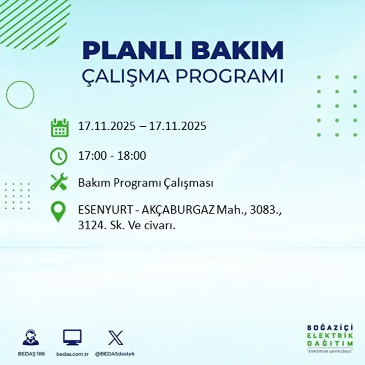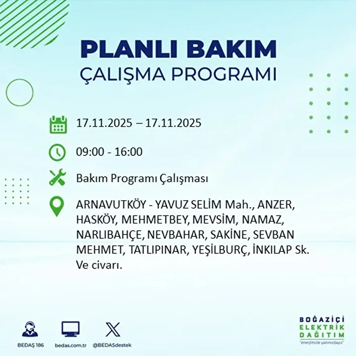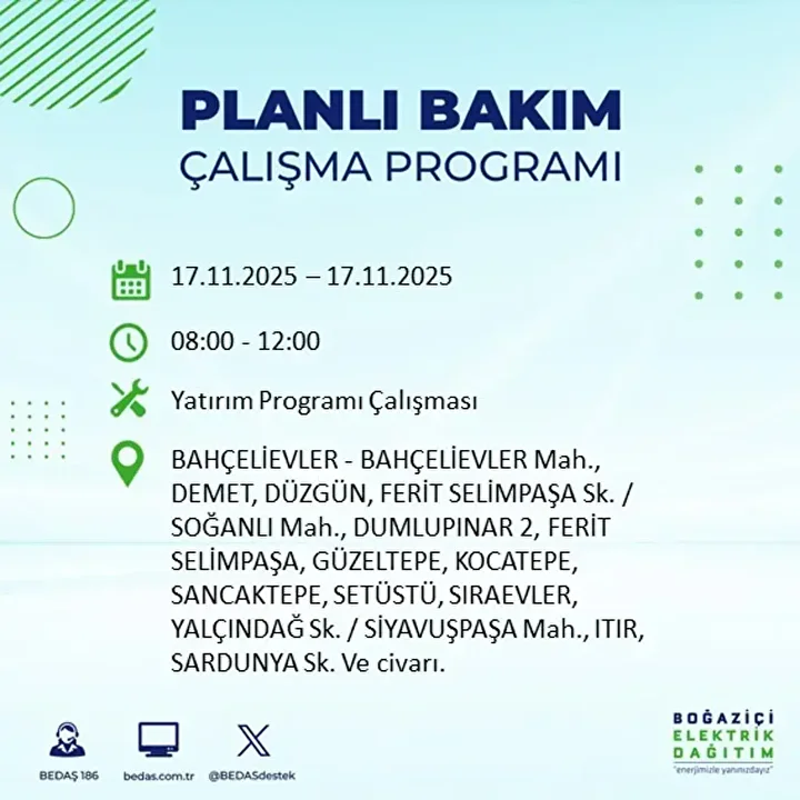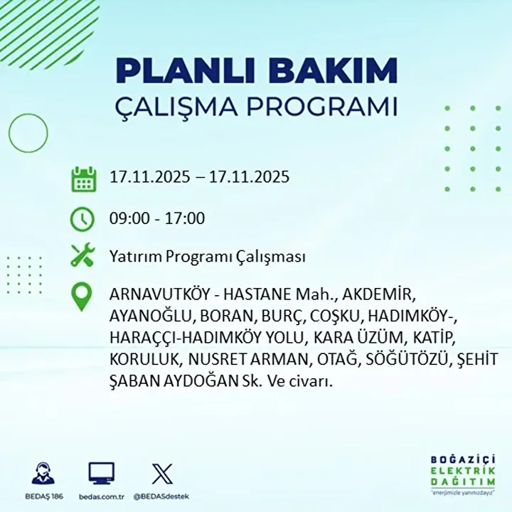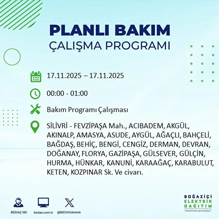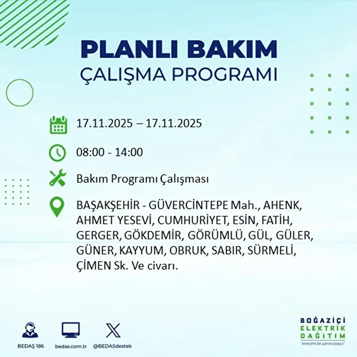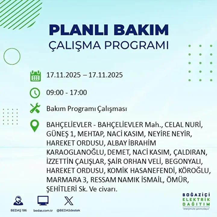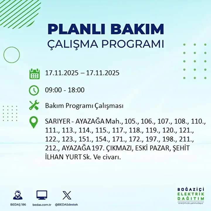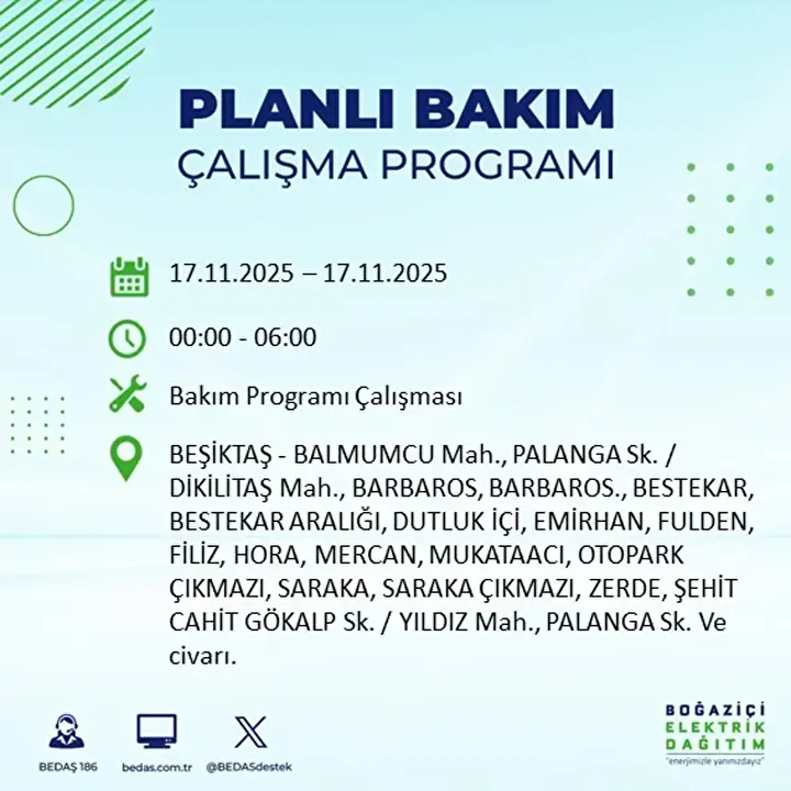 Şirketin her gün güncellenen planlı kesinti listesine göre, 17 Kasım’da geniş çaplı bir çalışma takvimi uygulanacak.