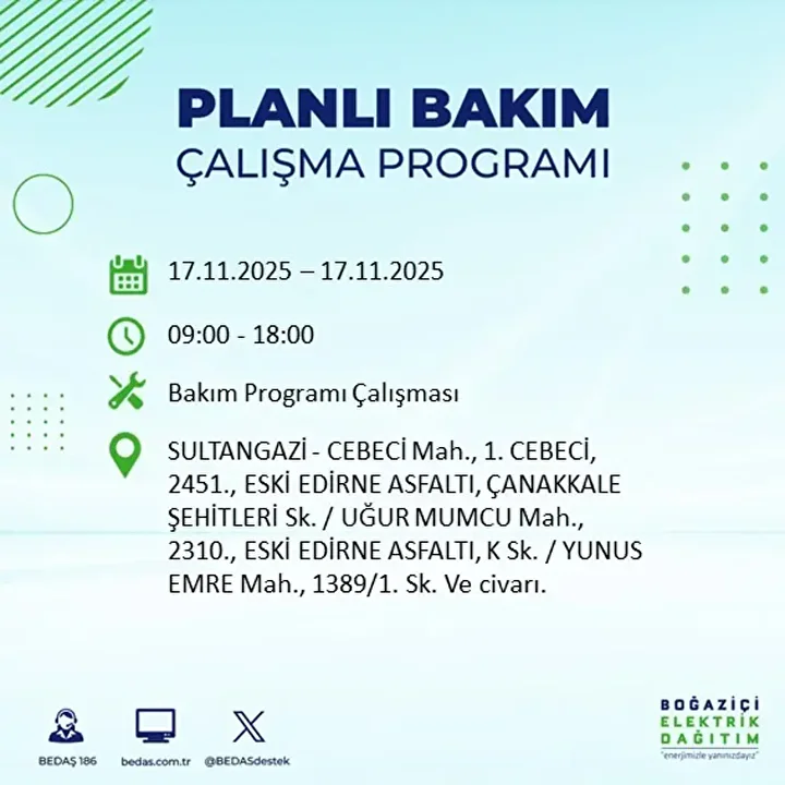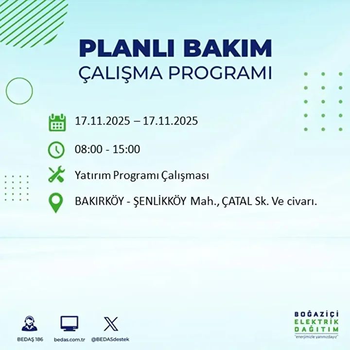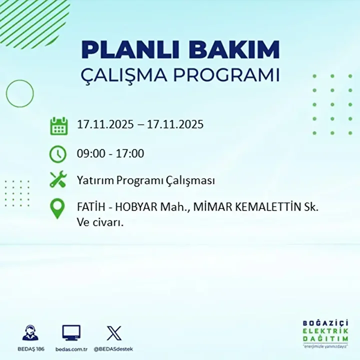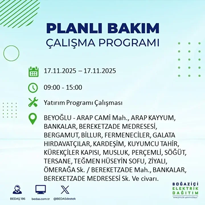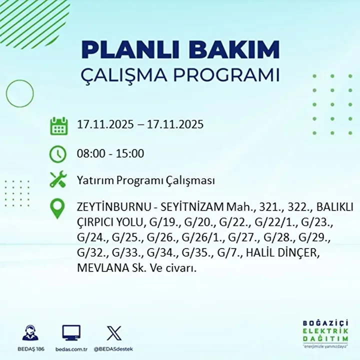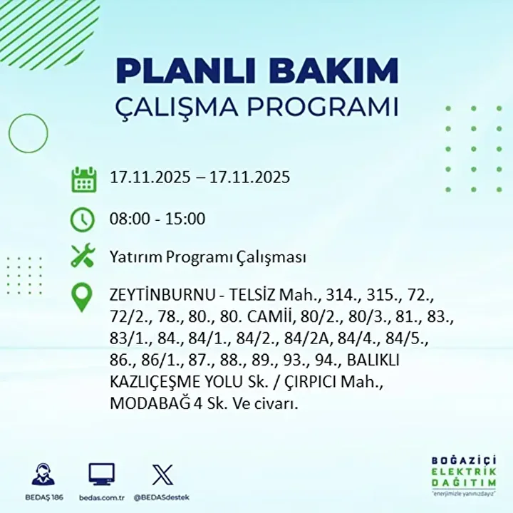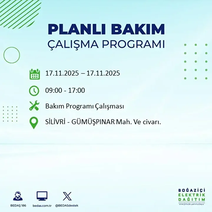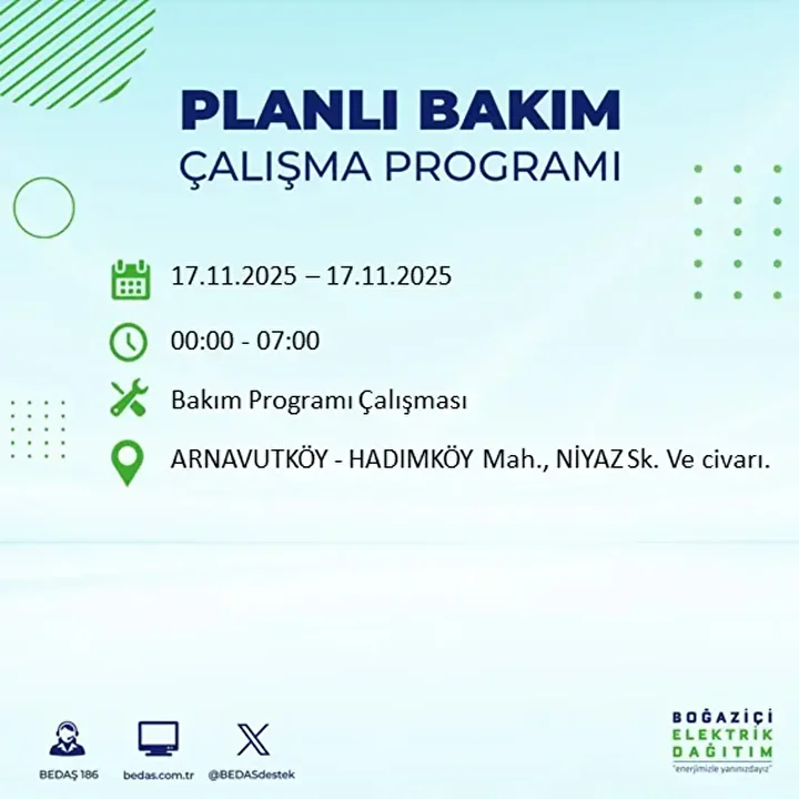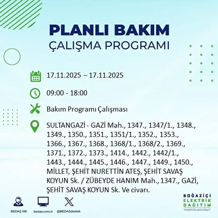 Şirketin her gün güncellenen planlı kesinti listesine göre, 17 Kasım’da geniş çaplı bir çalışma takvimi uygulanacak.