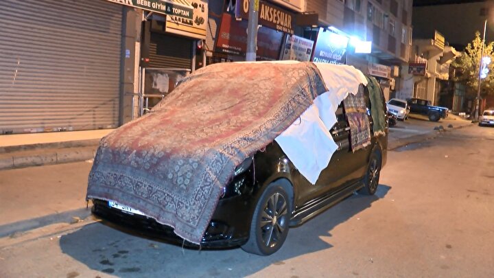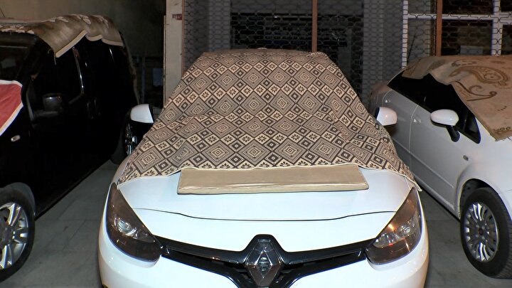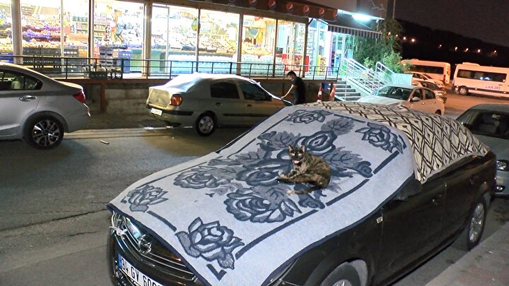 Perşembe ve Cuma günü şiddetli yağış ve dolu uyarısı yapılması üzerine araçlarını evlerinin önünde park etmek zorunda kalan vatandaşlar araçların üzerine halı ve battaniye örterek korumaya aldı.