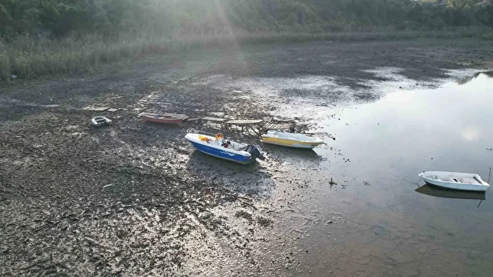 Suyun çekilmesiyle birlikte göl üzerinde yer alan iskeleler toprakta kaldı, tekneler karaya oturdu. Etrafı çamurla kaplanan göl kıyısında ortaya çıkan görüntüler, kuraklığın geldiği boyutu gözler önüne serdi.