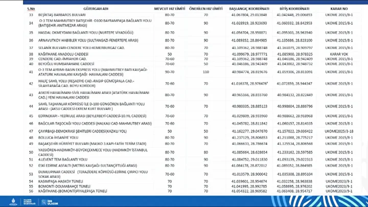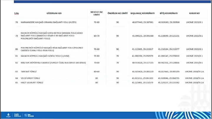 O-3 TEM Ayrımı-Basın Ekspress Yolu'ndaki yeni limit ise 100 kilometre/saat olarak güncellendi.