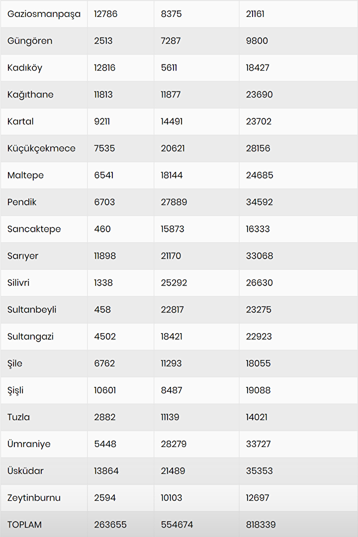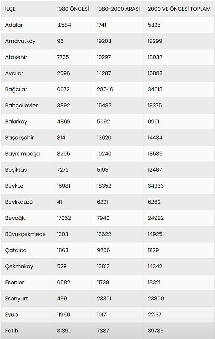 Yapım tarihi 2000 ve öncesine ait bina sayısının en düşük kaldığı ilçe 5 bin 325 adetle Adalar olurken, onu 6 bin 262 ile Beylikdüzü, 9 bin 800 ile Güngören, 9 bin 961 ile Bakırköy izliyor.