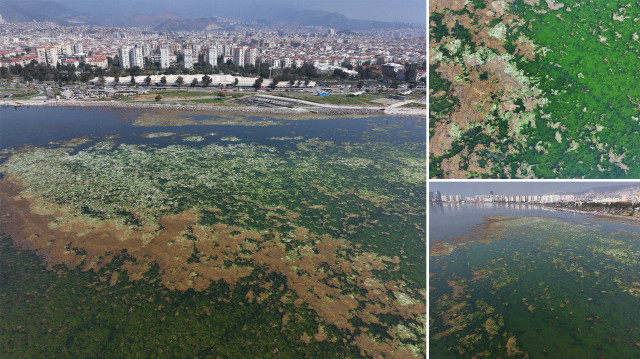 İzmir Körfezi'nin Bostanlı sahili tarafında, deniz suyundaki azot ve fosfor miktarının artmasıyla çoğalan deniz yosunu (Ulva lactuca) su yüzeyinde yeşil bir örtü oluşturdu.