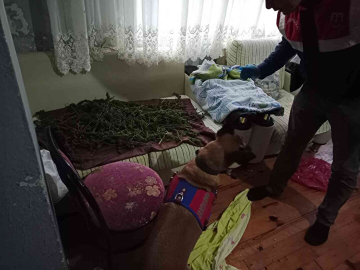 Narkotik madde tespit köpeği ‘Duman’ın da katıldığı aramada 6 kilogram skunk maddesi ve 18 kök skunk bitkisi ele geçirildi.