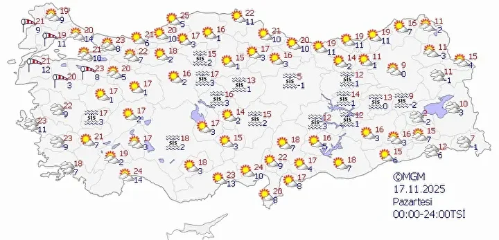 Sabah ve gece saatlerinde Marmara, İç Ege, Batı Akdeniz’in iç kesimleri, İç Anadolu'nun kuzeybatısı ile Batı ve Orta Karadeniz’in iç kesimlerinde yer yer pus ve sis bekleniyor.