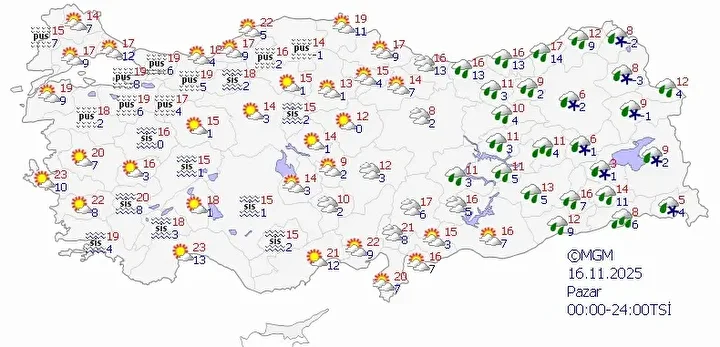 Meteoroloji Genel Müdürlüğü tarafından yapılan tahminlere göre, yurdun kuzey, iç ve doğu kesimlerinin parçalı ve çok bulutlu bir hava bekleniyor. Doğu ve Güneydoğu Anadolu’da gök gürültülü sağanak ve zaman zaman karla karışık yağmur beklenirken, İç Anadolu’da pus, sis ve düşük sıcaklıklar etkili olacak.