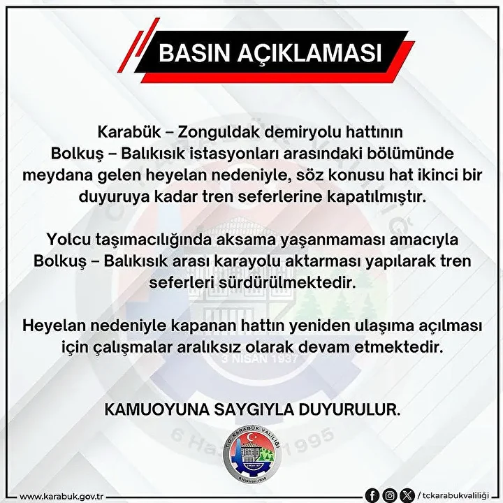 "Karabük-Zonguldak demir yolu hattının Bolkuş-Balıkısık istasyonları arasındaki bölümünde meydana gelen heyelan nedeniyle, söz konusu hat ikinci bir duyuruya kadar tren seferlerine kapatılmıştır. Yolcu taşımacılığında aksama yaşanmaması amacıyla Bolkuş-Balıkısık arası kara yolu aktarması yapılarak tren seferleri sürdürülmektedir. Heyelan nedeniyle kapanan hattın yeniden ulaşıma açılması için çalışmalar aralıksız olarak devam etmektedir."