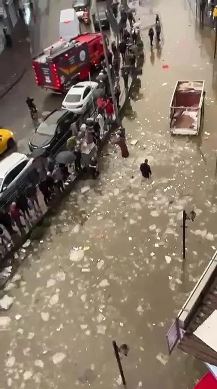 Kısa sürede şiddetini artıran yağmur ve dolu nedeniyle bazı işyerlerini su bastı, cadde ve sokaklar gölete döndü.