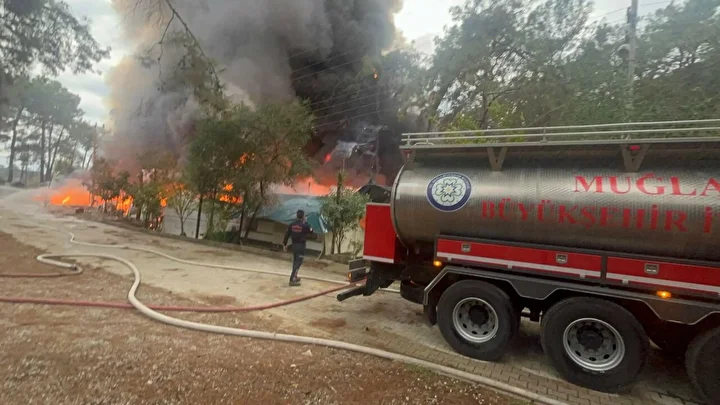 Muğla'nın Fethiye ilçesindeki Katrancı Koyu'nda bir karavanda saat 15.30 sıralarında çıkan yangın, kısa sürede diğer karavanlara da sıçradı.