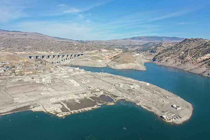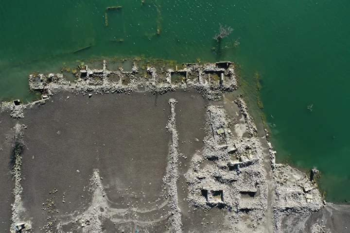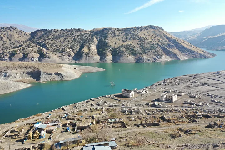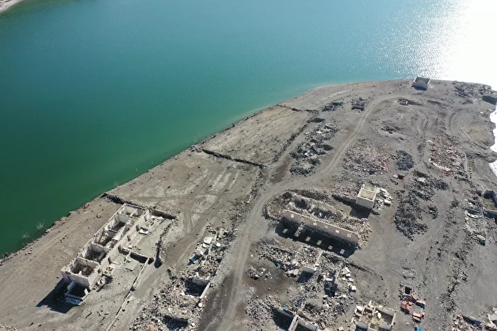 Kars'ın Sarıkamış ilçesindeki Karakurt HES Barajı'nda su seviyesinin düşmesiyle daha önce sular altında kalan köy evleri ve tarihi binalar tekrar gün yüzüne çıktı. Kars-Erzurum kara yolu üzerinde bulunan köyde görünür hale gelen yapılar havadan görüntülendi.