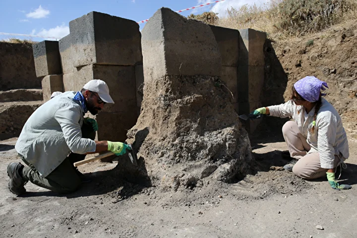 "Özellikle yukarı salonu tamamen ortaya çıkardık. Büyük bir yangın ve depremden dolayı salonumuzun yıkıldığını tespit ettik. Kazılarda mühür baskılarımız, seramik, taş aletleri, süs eşyaları, büyük bir duvara bağlantılı ocak olabileceğini düşündüğümüz bir alan ve burada kül ile hayvan kemikleri tespit ettik. Kazılarımız salonun giriş kısmı ve koridorlarında devam ediyor."