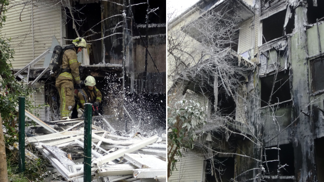 Binanın dış yalıtımında kullanılan ve hava koşullarının yıpratıcı etkisinden koruyarak ısı ve suya dayanıklı 'Siding' olarak bilinen dış cephe kaplama sistemi sökülürken dün saat 15.00 sıralarında nedeni bilinmeyen bir şekilde yangın başladı.