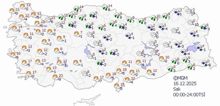 16 Aralık Salı günü, 18 ilde kar yağışı bekleniyor.