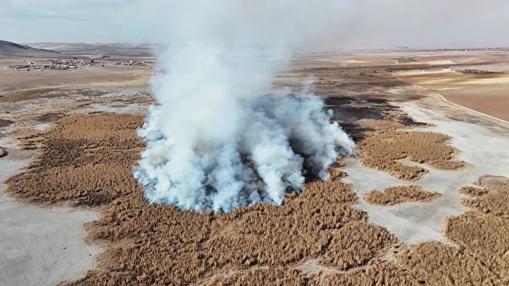 Konya'nın Kulu ilçesinde "kuş cenneti" olarak da bilinen ve geçen yıl tamamen kuruyan Gökgöl'deki sazlıklar 2 gündür aralıksız yanıyor.