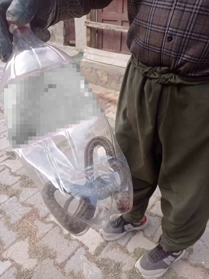 Yakalanan yılanı boş bir pet şişeye koyan mahalle sakinleri, daha sonra hayvanı ovaya götürerek doğaya sağ salim bıraktı.