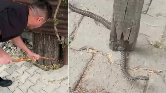Üç gün süren bekleyişin ardından yılanın yeniden ortaya çıkmasıyla mahalleli, ellerine aldıkları farklı araçlarla yılanı yakalamayı başardı.