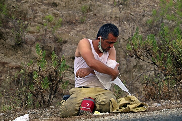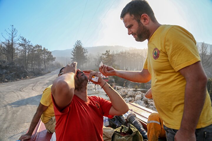 Bu sırada dumandan ve alevlerin arasındaki sıcaktan gözleri kuruyan ekip üyeleri, sağlık ekiplerinden aldıkları göz damlasını da birbirlerinin gözüne damlattı.
