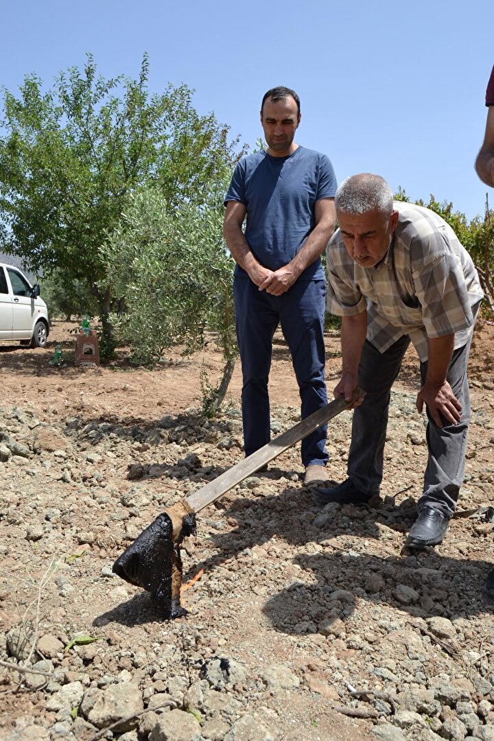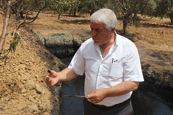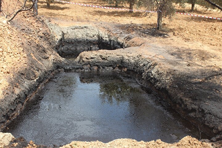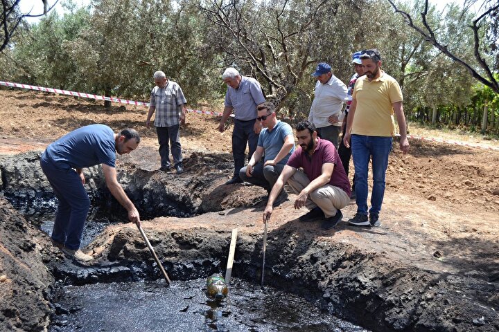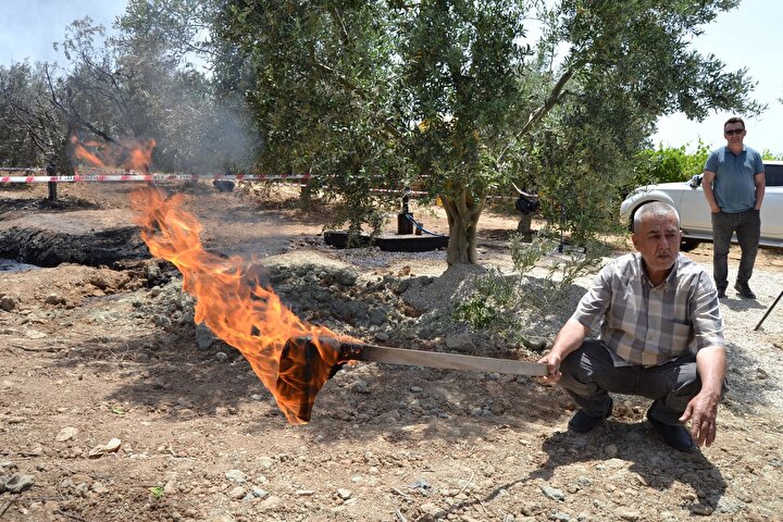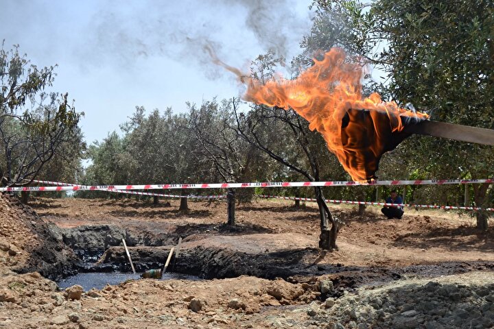 Ekiplerin müdahalesiyle alevler, kısa sürede söndürüldü. Yangının, zeytinlikteki su kuyusundan çıkan siyah sıvı maddenin tutuşmasından kaynaklandığı anlaşıldı.