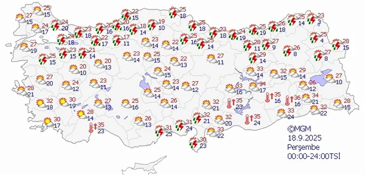 Meteoroloji Genel Müdürlüğü tarafından yapılan tahminlere göre, yurdun kuzey kesimlerinin parçalı, yer yer çok bulutlu, Marmara'nın doğusu ve Karadeniz ile Doğu Anadolu'nun kuzeyinin aralıklı sağanak ve gök gürültülü sağanak yağışlı, diğer yerlerin parçalı ve az bulutlu geçeceği tahmin ediliyor.
