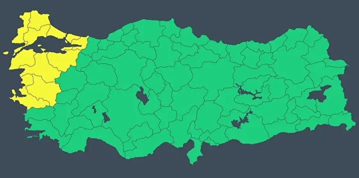 Balıkesir, Bursa, Çanakkale, Edirne, İstanbul, İzmir, Kırklareli, Kocaeli, Manisa, Tekirdağ ve Yalova için bugün sarı kodlu uyarı yapıldı.