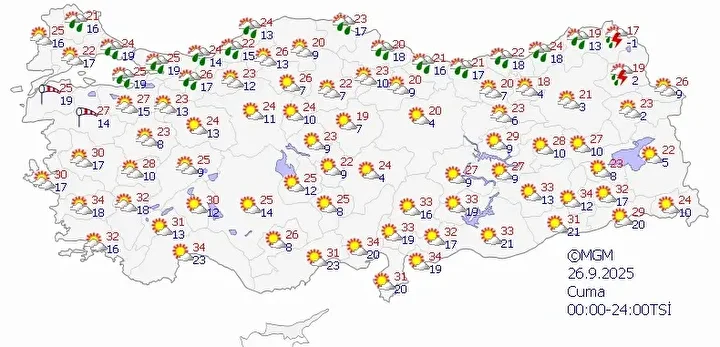 Meteoroloji Genel Müdürlüğü tarafından yapılan tahminlere göre, yurdun kuzey kesimlerinin parçalı, yer yer çok bulutlu, Orta ve Doğu Karadeniz kıyıları ile Kırklareli, Tekirdağ, İstanbul, Kocaeli, Sakarya, Yalova, Sinop, Tokat ve Artvin çevreleri, Balıkesir’in ve Kastamonu'nun kuzeyi ile Çanakkale’nin iç kesimlerinin yerel olmak üzere sağanak yağışlı, diğer yerlerin az bulutlu ve açık geçeceği tahmin ediliyor. Sabah ve gece saatlerinde Marmara ve Karadeniz'in iç kesimlerinde pus ve yer yer sis bekleniyor.