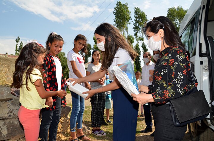 Buradaki ziyaretlerinde ilk olarak öğrencilerine dezenfekten ve maske dağıtan gönüllü ekip, salgınla mücadele noktasında alınması gereken tedbirleri yerine getiriyor.