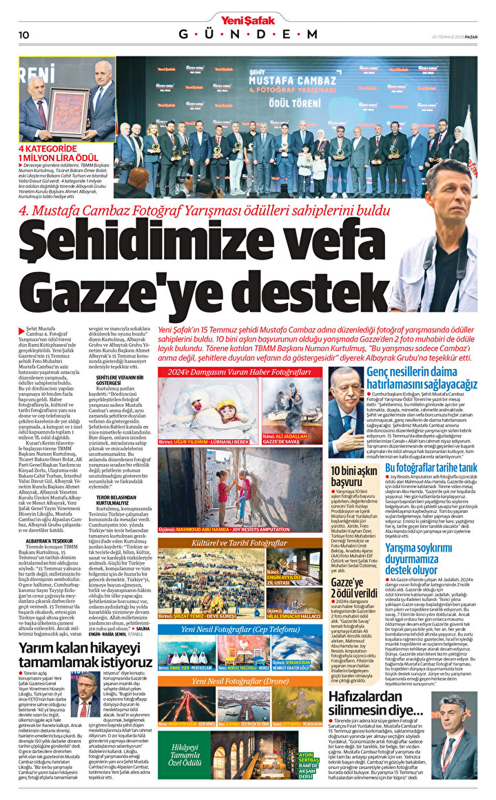 Yeni Şafak’ın 15 Temmuz şehidi Mustafa Cambaz adına düzenlediği fotoğraf yarışmasında ödüller sahiplerini buldu. 10 bini aşkın başvurunun olduğu yarışmada Gazze’den 2 foto muhabiri de ödüle layık bulundu. Törene katılan TBMM Başkanı Numan Kurtulmuş, “Bu yarışma sadece Cambaz’ı anma değil, şehitlere duyulan vefanın da göstergesidir” diyerek Albayrak Grubu’na teşekkür etti.